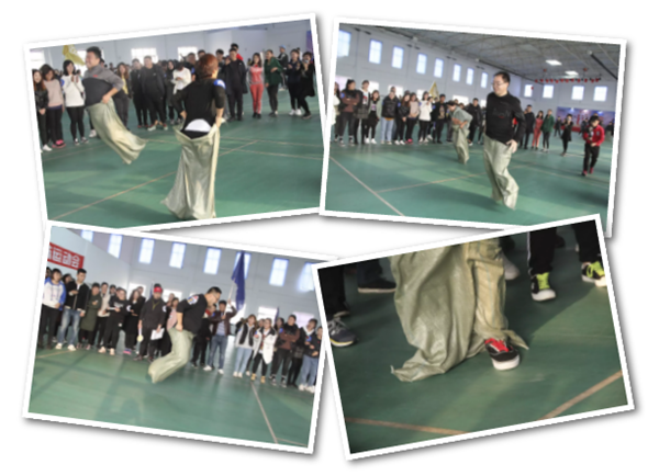 此次“袋鼠跳”全程往返為20米,以麻袋為道具。比賽規(guī)則是,隊員們排好隊,站在起跑線上,聽到發(fā)令后,進入麻袋,并向前跳躍,然后到了折返點后再跳回來,第二人接力,以此類推,直至4人全部完成,用時最短隊伍名次列前。